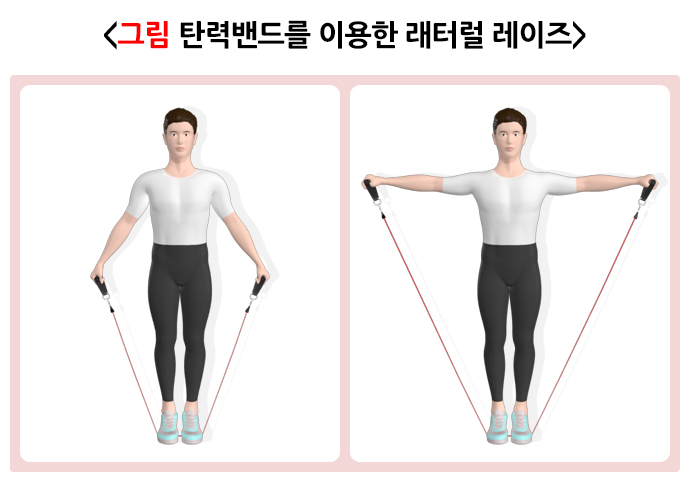 • 안정성 운동은 주로 탄력밴드를 이용한 래터럴 레이즈 운동이 대표적입니다. 래터럴 레이즈 운동을 할 때는 빠르지 않은 속도로 3~5세트, 1세트 당 10~20회 정도 수행하는 것이 좋으며, 세트 간 약 1~2분 휴식을 갖습니다. 래터럴 레이즈 운동은 주 2~3회 정도 시행하는 것이 좋습니다. 운동 시 어깨 높이 이상으로 탄력 밴드 손잡이를 올리는 경우 어깨 부상이 발생할 수 있으므로 주의하여 시행합니다.