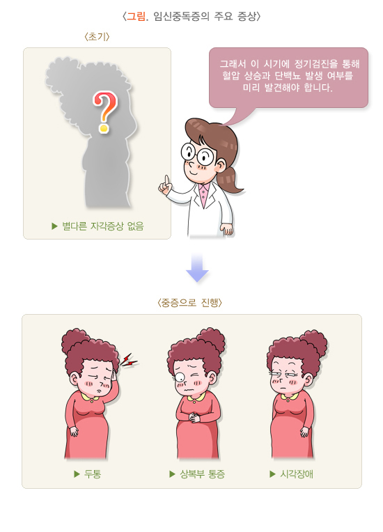 임신중독증의 초기 증상은 체중이 갑자기 늘고, 몸이 붓는 것입니다. 이런 증상은 보통 임신에서도 나타날 수 있어 정상 임신과 구분이 어려운 경우가 대부분입니다. 그러나 질환이 심해져서 중증의 임신중독증이 되면 두통, 시력장애, 오른쪽 상복부 통증이 생기고 소변량이 줄어듭니다. 이때 혈압을 측정하고, 소변과 혈액 검사를 하면 고혈압과 단백뇨가 확인되고, 혈액검사에서는 혈소판 감소증과 간수치 증가가 흔히 나타납니다. 이 질환은 태아에게도 영향을 주어, 자궁내 태아 성장 장애, 양수 과소증이 발생하며 심한 경우에는 태아가 사망할 수도 있습니다.
