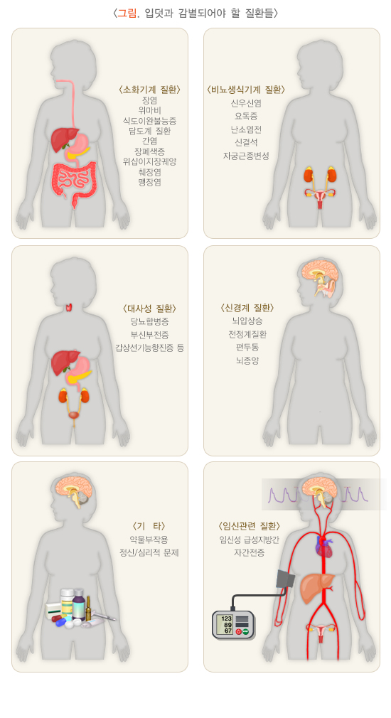 입덧이 있을 경우 감별해야 할 질병들이 있고, 구역과 구토 같은 입덧 증상의 처음 발생 시점이 중요합니다. 대부분의 임신부는 임신 9주 이전에 첫 증상을 느끼게 되며, 임신 9주 이후 처음 경험한 구역과 구토에서는 다른 원인을 반드시 감별해야 합니다. 임신 전에 발생한 구역과 구토를 동반하는 만성적인 질환(담석증 및 당뇨와 연관된 질환)을 고려해야 하며, 구역과 구토가 임신으로 인한 것이 아님을 알리는 신체 증상 및 증후에 주의를 기울여야 합니다.