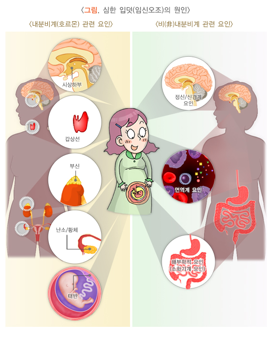 최근에 보고된 임신 오조 발생원인을 요약해보면, 시상하부/부신샘, 갑상샘, 난소/황체, 태반 등의 내분비계 영향과 면역학적, 해부학적, 신경학적 원인 등이 연관된 비내분비계 영향들 간에 복잡한 상호작용으로 임신 오조가 발생한다고 합니다.