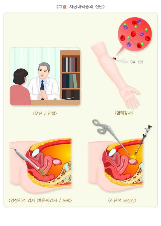 자궁내막증은 병변의 위치와 침범된 장기, 병변의 깊이에 따라 다양한 증상을 보이며, 증상과 병변의 심한 정도(크기)가 관련성이 없다는 특징을 보입니다. 따라서 병력 청취만으로는 정확한 진단이 어렵고 추가적인 검사가 꼭 필요한 경우가 많지만, 통증 및 증상들의 양상이나 기간 등에 대한 문진을 통해 진단을 추정하고 추후 치료에 필요한 정보들을 얻을 수 있기 때문에 자세한 문진이 필요합니다. 현재 자궁내막증의 진단에 사용되는 임상적 검사로는 질식 초음파 검사, 자기공명영상검사(MRI), 혈액검사, 진단적 복강경 등이 있습니다. 현재까지는 자궁내막증의 확진을 위한 가장 표준적인 방법으로 진단적 복강경이 사용되고 있지만, 최근에는 환자들의 임상증상과 진찰 소견, 기타 검사결과를 종합적으로 판단하여 자궁내막증의 여부를 추정 진단하여 수술 전에 미리 약물치료를 시작하여 약물치료에 대한 반응을 통해 진단과 치료를 함께 진행하는 방향으로 패러다임의 변화가 나타나고 있습니다.