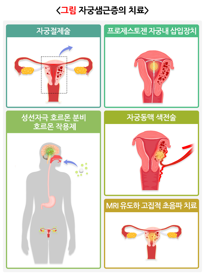 심한 자궁 출혈이 있는 경우 자궁경을 이용하여 자궁내막절제술을 시행할 수 있습니다. 최근에 자궁동맥색전술을 시행한 후 약 27개월 동안 관찰한 결과 75.7%의 환자에서 증상의 호전을 보였다는 보고가 있고, 하이푸(HIFU: High Intensity Focused Ultrasound 고강도집적초음파)를 이용한 치료로 월경과다와 월경통 경감에 효과적이라는 보고도 있기는 합니다. 그러나 이러한 치료를 받은 여성에서 이후 임신을 할 경우의 안전성 등에 대한 정보가 아직까지 충분하지 않기 때문에 임신계획이 있는 여성은 주의가 필요합니다. 이와 같이 다양한 치료법이 있지만 심한 증상을 동반한 자궁샘근증은 자궁절제술 외에는 결정적인 치료방법이 없는 것으로 여겨지고 있습니다.