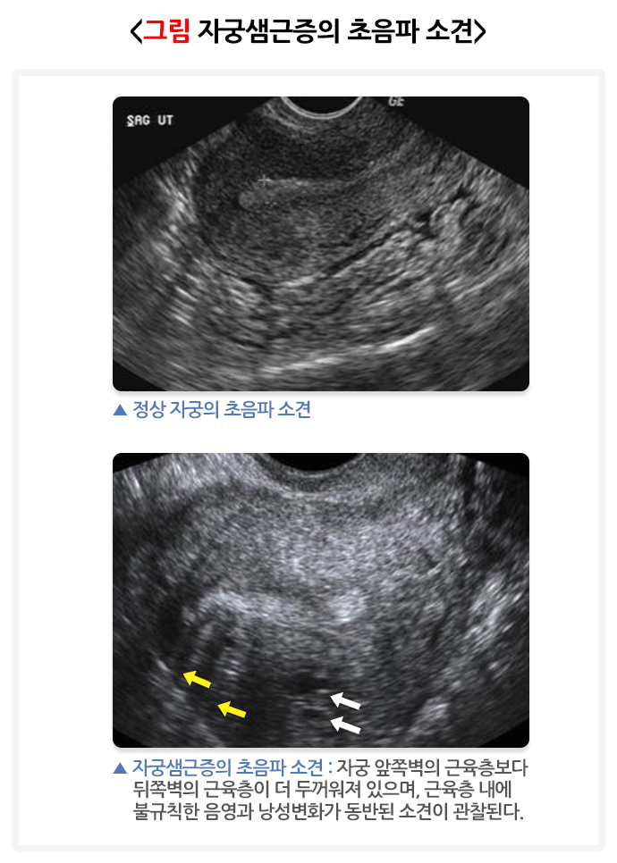 자궁근종은 초음파에서 경계가 명확하게 보이는 데 반해, 자궁샘근증은 경계가 명확하지 않습니다. 그러나 자궁근종과 감별이 어려운 경우도 있어 자궁샘근증을 가진 많은 여성들이 자궁근종을 가지고 있는 것으로 오해하는 경우도 있습니다. 그러나 자궁근종과 자궁샘근증은 완전히 다른 질환으로, 질병의 치료 역시 다르게 접근해야 합니다. 따라서 정확한 진단이 매우 중요합니다.
