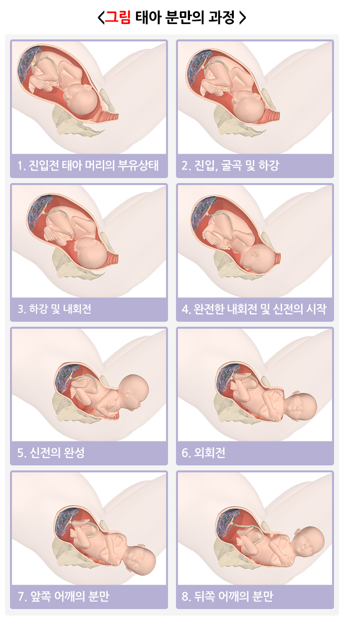 태아의 머리가 모체의 골반을 내려오는 동안 수동적으로 태아머리의 앞부분과 뒷부분이 임신부 골반의 앞뒤 축에 일치하도록 태아의 후두가 전방으로 회전하면서 내려오는 것입니다. 거의 대부분은 뒷통수가 치골결합쪽으로 위치하지만 15~20%에서는 후방으로 위치하며, 이 중 5% 는 분만 종료 시까지 그 방향을 유지합니다.