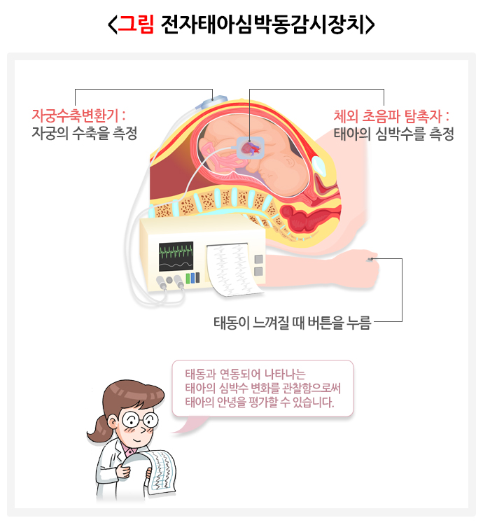진통으로 입원하는 모든 임산부는 전자태아심박동감시장치를 이용한 검사를 받게됩니다.