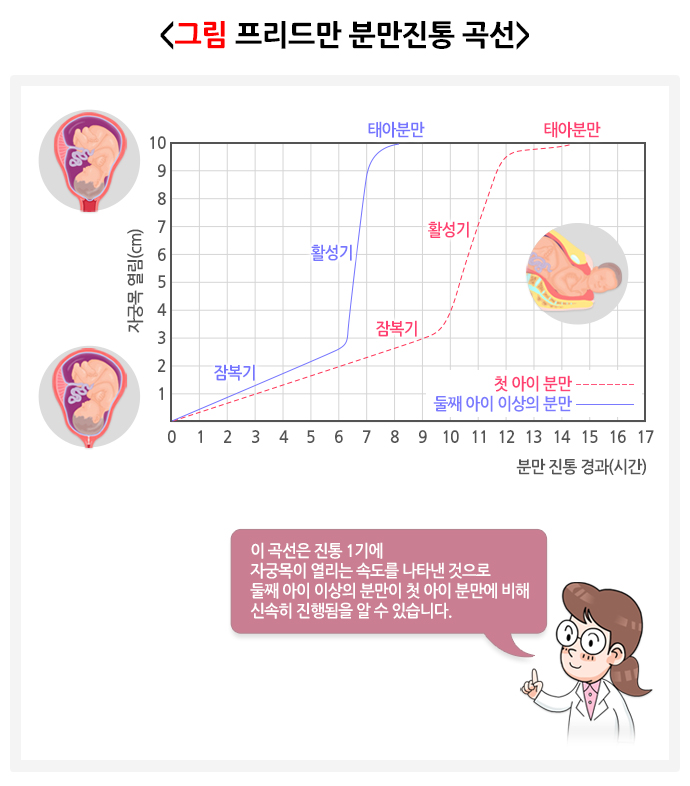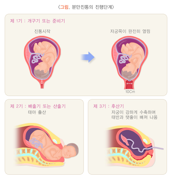 분만 진통은 자궁목이 열리는 제1기, 태아가 탄생하는 제2기, 자궁에서 태반이 빠져나오는 제3기의 세 단계로 나누며, 출산에 걸리는 시간은 첫째 아이 출산의 경우 보통 16~18시간, 둘째 아이 이상 출산의 경우에는 6~8시간 정도입니다. 진행에 따라 적절한 호흡법과 무통 시술 등을 시행하면 출산 시의 진통을 줄일 수 있습니다.