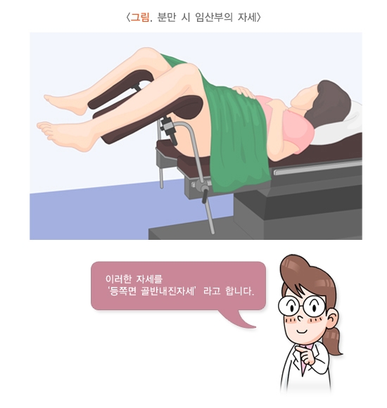 분만 시 가장 널리 사용되는 임산부의 자세는 다리를 지지해주는 분만대에서 ‘등쪽면 골반내진자세’를 취하는 것입니다.