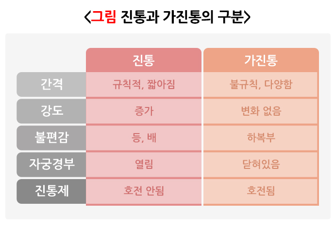 진통의 간격을 체크합니다. 진통은 규칙적인 자궁의 수축을 일컬으며 처음에는 20~30분 간격으로 10~20초간 지속됩니다. 시간이 지나면서 진통과 진통 사이 간격이 점점 짧아져 10분 이내로 찾아오면서 진통 강도도 커집니다. 일반적으로 진통과 가진통의 차이는 다음 그림과 같습니다.