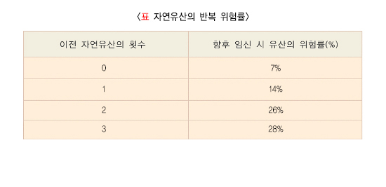 자연유산은 반복적으로 발생할 수도 있습니다. 대개 두 번 이상의 연속적인 자연유산을 경험한 이후부터는 반복유산의 위험성이 증가될 수 있으며, 3번 이상의 반복유산이 있었더라도 이후 유산될 위험률은 30~40%를 넘지는 않습니다. 자연유산의 횟수에 따른 반복유산의 위험률은 다음의 표와 같습니다.