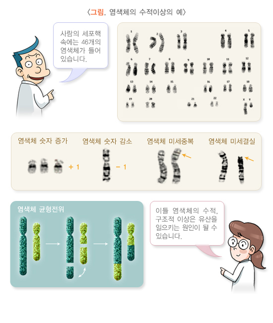 염색체의 구조적 이상은 흔히 습관성유산의 원인이 됩니다. 특히 부모 염색체의 균형전위가 염색체 이상으로 인한 자연유산의 가장 많은 원인이 되는데, 반복적인 유산을 경험하는 부부의 약 4~5%에서 발견된다고 보고되고 있습니다. (부모의 혈액을 채취하여 염색체 검사를 하면 알 수 있습니다.)