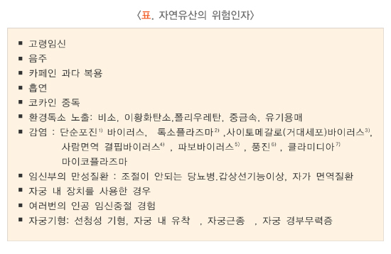 자연유산은 임신부의 나이가 증가할수록 빈도가 증가합니다. 40세 임신부는 20세의 임신부에 비해 자연유산의 빈도가 2배 정도 증가하게 됩니다.
