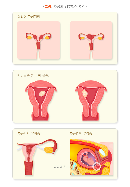 일반 여성에서 자궁경부와 자궁체부의 해부학적 이상의 빈도는 정확히 알려져 있지 않지만, 반복유산 환자에서는 약 12~16% 정도로 추정됩니다. 해부학적 이상으로는 선천적으로 발생한 자궁기형과, 후천적으로 발생한 해부학적 이상으로 자궁근종, 자궁내막 유착, 자궁내막증, 자궁경부 무력증 등이 있습니다.