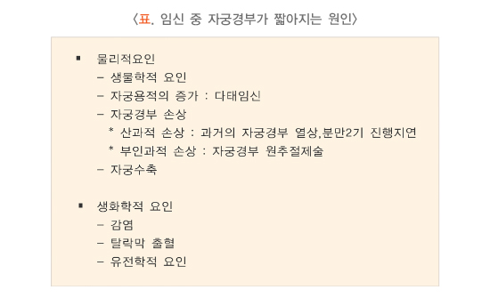 다음 표는 임신 중 자궁경부가 짧아지는 원인들입니다. 물리적 요인, 자궁 용적이 늘어나거나 자궁경부의 손상 등 기존의 알려진 원인 이외에 질과 자궁내 감염에 의한 염증과 탈락막 출혈 등이 지속적인 화학적 변화를 일으켜서 임신 중 자궁경부가 짧아질 수 있습니다.
