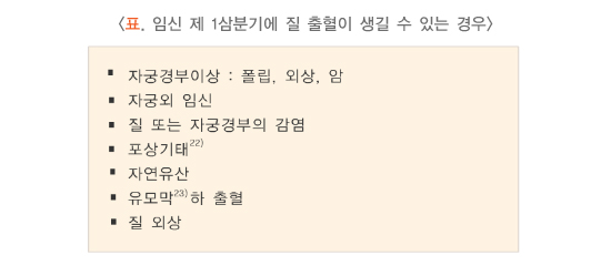 임신 제 1삼분기(첫 3개월)에 질 출혈이 발생했을 경우에는 절박유산 외에 다양한 원인들이 있을 수 있으므로 반드시 산부인과 전문의 진료를 받아야 합니다.