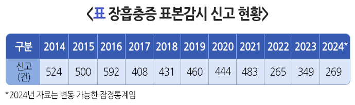 • 표본감시기관은 기생충 감염병 신고서를 작성하여 질병관리청으로 팩스 또는 웹 입력 방법으로 신고* 표본감시기관 여부 확인: 관할 보건소로 문의