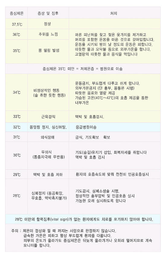 저체온증은 방광이나 직장에서 측정한 중심체온이 35℃ 미만일 경우를 말하며, 온도에 따라 3가지 단계로 분류하는데, 32℃~35℃를 경증, 28℃~32℃를 중등도, 28℃도 미만을 중증으로 나뉩니다.(겨드랑이나 구강체온계로 측정한 경우에는 정확한 중심체온을 반영할 수 없습니다.)