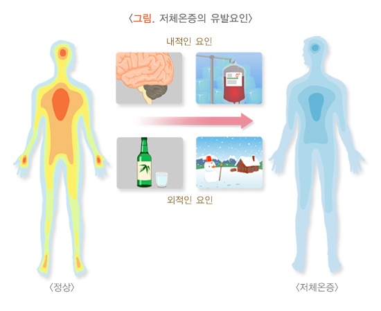 내적인 요인은 외상에 의한 뇌신경계의 기능저하로 인한 열조절능력의 장애이며, 외적인 요인은 다량의 출혈에 의한 쇼크증상으로 가온되지 않은 수액 및 수혈 등의 치료에 의한 것입니다. 그 밖에 추위에 오래 노출된 경우, 갑상선기능저하증· 부신기능저하증·뇌하수체기능저하증·저혈당증 등의 질환이 있는 경우, 수면제 등의 약물을 복용한 경우에 저체온증이 쉽게 생깁니다. 특히 술을 마신 경우에는 중추신경계의 기능을 저하시켜 사지 맨 끝부분의 혈관확장을 유발하여 복사에 의한 열손실이 크게 증가하므로, 음주는 저체온증을 일으키는 흔한 원인 중 하나가 됩니다.