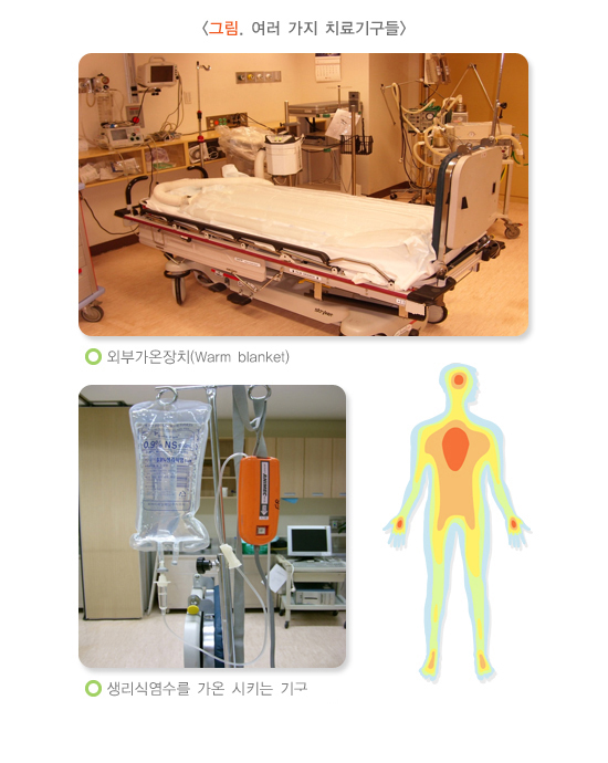 환자가 병원에 도착한 이후 치료의 기본 원칙은 병원 전 처치의 기본 개념과 크게 다르지 않습니다. 일단 경증의 경우 병원 전 처치에 쓰이는 방법인 외부가온장치(warm blanket), 담요 덮기, 가온된 물통을 겨드랑이나 체간부에 올려주는 방법 및 40℃ 정도로 가온된 생리식염수를 정맥에 주사하는 방법을 사용합니다.