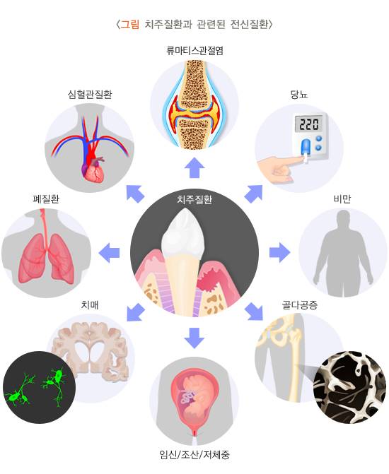 사회의 고령화와 더불어 가장 큰 폭으로 증가하는 질환 중 하나인 치주질환은 세균에 의한 만성 감염병으로, 다른 만성질환들과 위험요인을 공유합니다. 생활습관, 식이, 흡연 등의 위험요인으로 인해 치주질환이 악화되며, 반대로 치주질환이 심혈관계질환, 고혈압, 당뇨병, 저체중 조산, 류마티스관절염, 만성 콩팥질환, 골다공증 등을 악화시킬 수 있습니다.