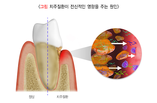 치주조직에 염증이 생기면 염증인자(inflammatory cytokine)는 물론 세균 자체가 혈관을 통해 전신으로 퍼질 수 있습니다. 대표적인 세균이 최근 많이 연구되는 진지발리스 균(P. gingivalis)입니다. 염증인자와 세균은 전신의 조직과 기관에 영향을 미쳐 조직의 균형을 깨뜨리기도 하고, 염증을 일으키거나 기존 염증을 악화시킵니다.