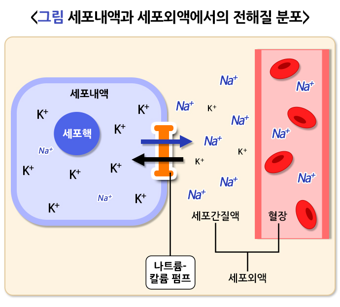 우리 몸의 60%는 물입니다. 이 물에는 전해질(electrolyte)이라고 하는 물질들이 녹아 있습니다. 전해질은 물에 녹았을 때 이온(전하를 가진 입자)으로 분리되는 물질을 말합니다.
