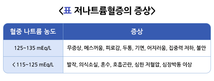 항이뇨호르몬(ADH) 과다 분비, 갑상선기능저하증, 또는 부신기능부전 등 체액 손실 없이 나트륨이 부족해진 경우는 하루 800~1000 mL로 수분섭취를 제한하며 기저 원인을 치료합니다.