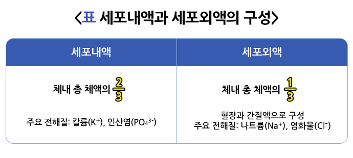 우리 몸속에 있는 물을 체액이라고 합니다. 체액은 다시 세포내액과 세포외액으로 나뉩니다. 각 체액의 주요 전해질은 다음과 같습니다.