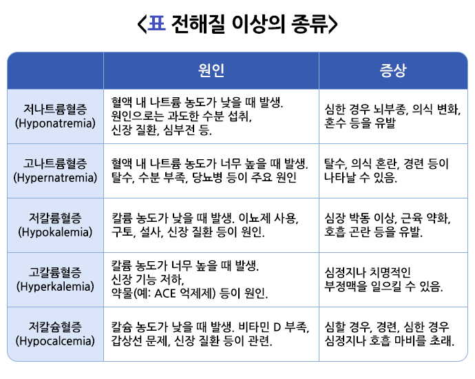 전해질 이상에는 전해질 농도가 정상치보다 높은 경우(고나트륨혈증, 고칼륨혈증 등)와 전해질 농도가 정상치보다 낮은 경우(저나트륨혈증, 저칼륨혈증 등)가 있습니다.