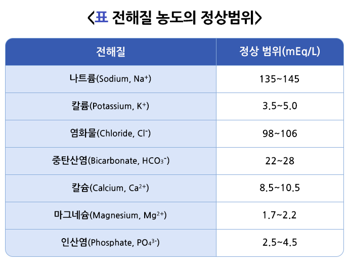 전해질 이상(electrolyte imbalance)은 체내 전해질 농도가 정상 범위를 벗어난 상태를 의미합니다. 체내 주요 전해질 농도의 정상 범위는 다음과 같습니다.