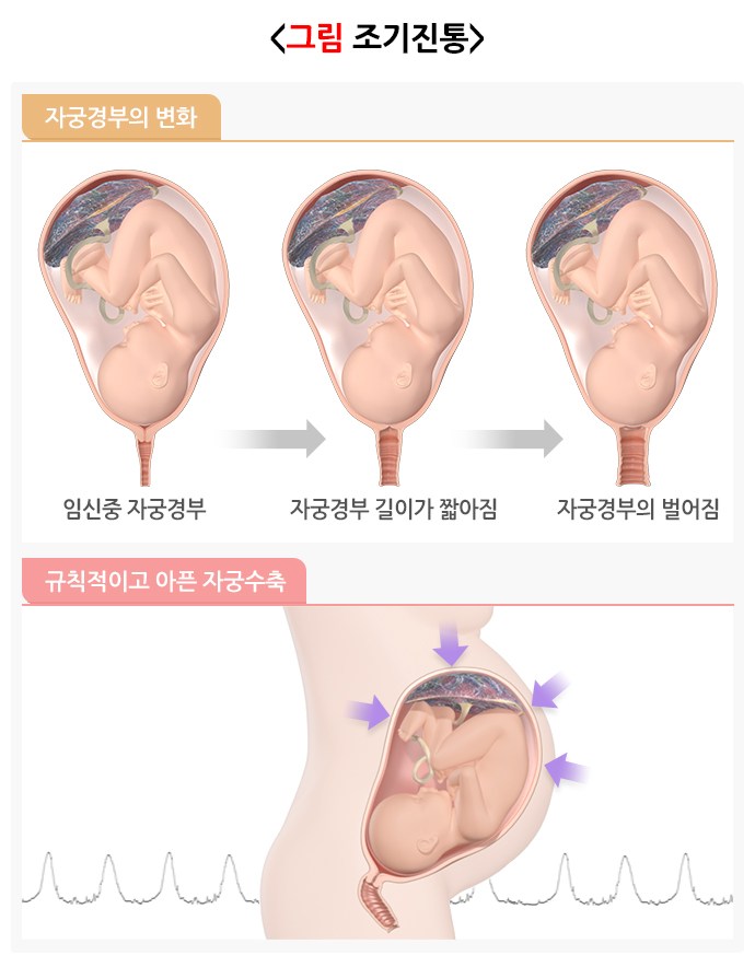 조기진통은 ‘임신 37주 이전에 자궁 경부가 열리거나 짧아지면서 동시에 규칙적인 자궁 수축이 발생하는 경우'로 정의합니다. 여기서 자궁수축은 흔히 ‘배뭉침’이라고 하는데 강도 및 주기, 산모가 느끼는 주관적인 증상이 다양해 자궁경부의 변화가 있기 전에는 가진통과 진성진통을 구별하기가 매우 어렵습니다. 배뭉침은 주로 낮보다 밤에 잘 느낍니다. 손바닥을 자궁이 위치한 부위에 놓으면 배가 딱딱해지는 순간을 느낄 수 있습니다. 대개 통증은 없지만 간혹 딱딱해지고 뭉치면서 생리통처럼 아픈 경우도 있습니다. 가진통이라면 휴식을 취하거나 자세를 바꾸면 금세 없어집니다. 임신 중 흔히 발생하는 가진통은 정상적인 현상이며 분만으로 이어지지 않기 때문에 입원이나 치료가 필요하지 않습니다. 하지만 진성진통이라면 배뭉침이 규칙적이면서 지속적이고, 시간이 지나면서 조금씩 더 강한 진통이 발생합니다. 질출혈이 동반되기도 하고 양수가 새어 나올 수도 있습니다.산모 스스로 조기진통의 구별이 어려울 수 있으므로 이상 징후가 느껴지면 즉시 병원을 찾아야 합니다. 진통은 전형적이지 않은 경우도 있어 요통이나 골반이 내려앉는 느낌이 들기도 하며, 질 분비물이 비정상적으로 증가하기도 합니다. 따라서 질 분비물 증가, 물 같이 흐르는 질 분비물, 출혈, 규칙적인 복통, 평소와 다른 통증이 발생한 경우에도 즉시 병원을 찾아야 합니다.
