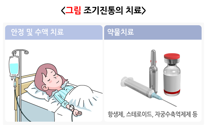 조기진통에 대한 완벽한 치료는 없습니다. 다만 임신 기간을 다소 연장해 추후 조산아의 예후를 개선시키기 위해 여러 약제들을 사용합니다. 이러한 약제들도 부작용과 단점이 있으므로 산모의 상태에 따라 사용 여부를 선별해야 합니다.