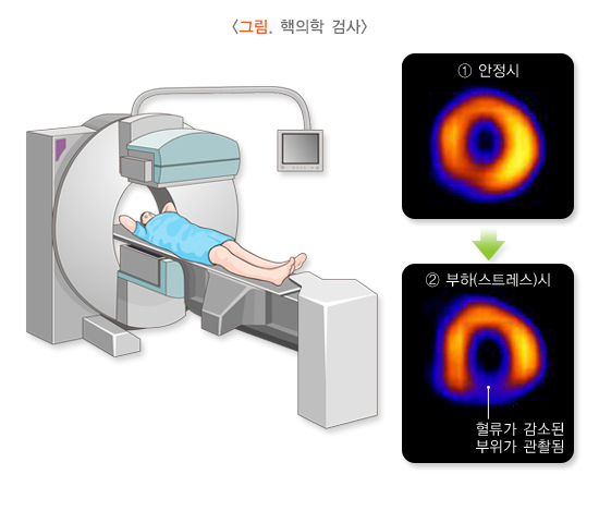 핵의학 검사는 동위원소를 이용하여 협심증과 허혈성 심장병 등 죽상경화증에 의해 발생하는 관상동맥 질환을 진단하는 검사입니다. 운동부하 심전도 검사가 어려운 경우이거나 위양성율이 높다고 판단되는 경우에 유용하게 사용할 수 있는 검사이며 부작용은 거의 없는 것으로 알려져 있습니다. 주로 심장의 산소요구량을 증가시키는 약물을 이용하여 스트레스를 준 후 사진을 촬영한 후 안정시의 사진과 비교하여 협심증의 유무를 판단합니다.