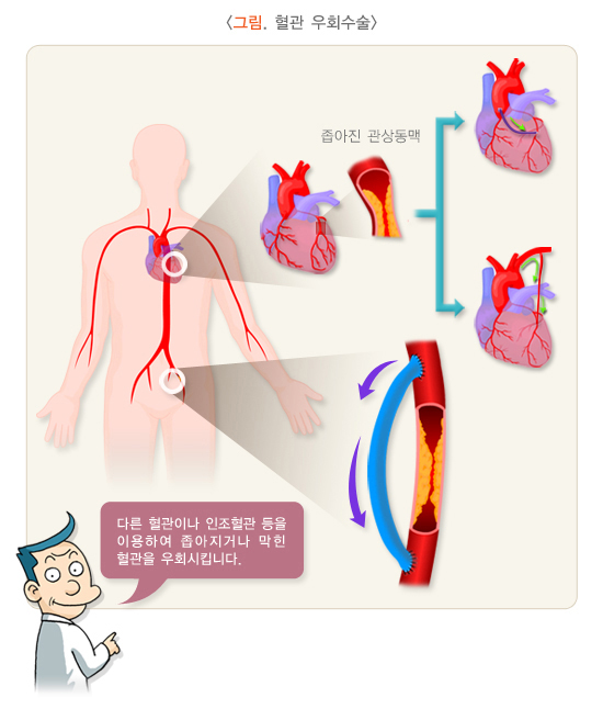 죽상경화증으로 인하여 혈관의 협착이나 폐색이 광범위한 경우, 인조혈관을 이용하여 폐색이 있는 부위를 우회시키는 수술을 하기도 합니다.