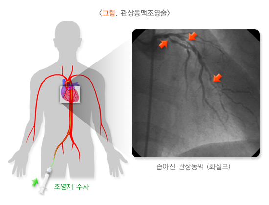 관상동맥조영술은 관상동맥(심장혈관)의 죽상경화증으로 인하여 발생하는 허혈성 심장질환을 진단하는 가장 정확한 검사 방법입니다. 관상동맥조영술을 통하여 혈관의 협착이나 폐색 부위를 정확히 진단하면서 동시에 경피적 관상동맥 성형술이나 스텐트 삽입술을 시도할 수 있습니다. 최근 사용 기기의 소형화와 기술의 발달로 인해 많은 병원에서 관상동맥조영술을 최종 진단방법으로 이용하고 있습니다. 관상동맥조영술의 단점은 침습적 검사이기 때문에 검사에 따른 약간의 합병증 등이 있을 수 있다는 점입니다.