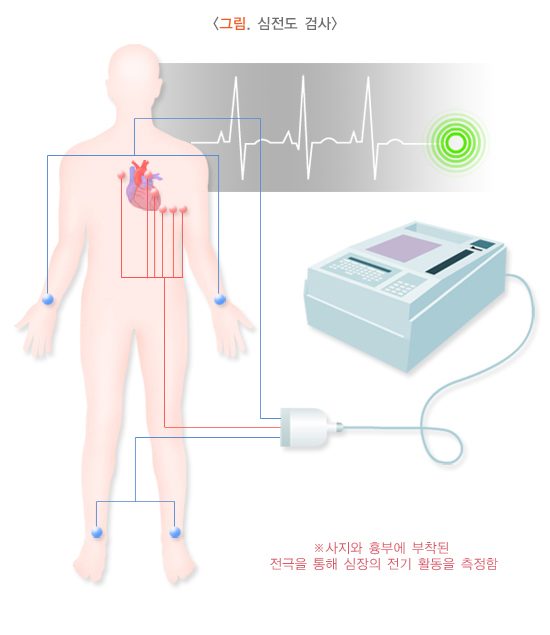 심전도 검사는 심장질환의 가장 기본 검사로 모든 심장질환이 의심되는 환자를 대상으로 일차적으로 시행합니다. 죽상경화증이 심하더라도 안정시의 심전도는 대부분 정상으로 나타나기 때문에 심전도에 이상이 없다 하더라도 죽상경화증이 없다고 판정할 수 없습니다. 초기의 심전도 검사는 급성심근경색증 같은 심한 경우의 진단에 대단히 중요합니다.