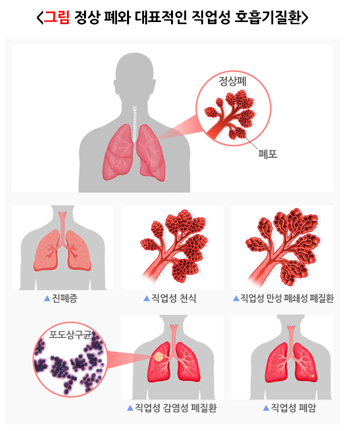 여기서는 직업성 호흡기 질환 중 가장 흔한 진폐증, 직업성 천식, 직업성 만성폐쇄성폐질환, 직업성 감염성 폐질환, 직업성 폐암을 다루겠습니다.