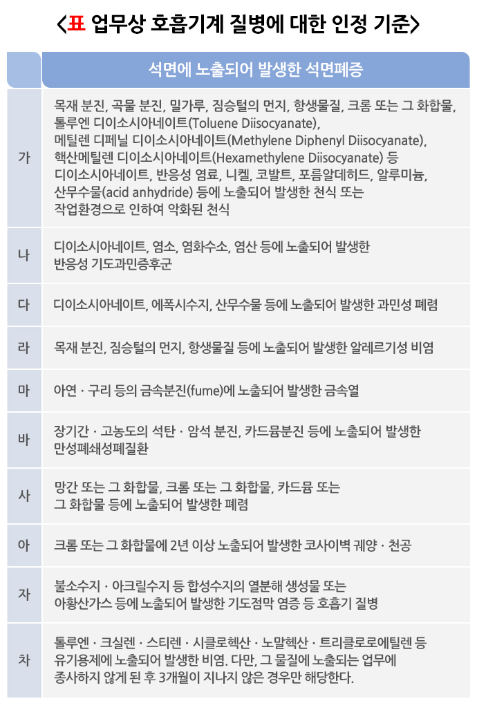업무 중 노출된 유해인자로 인해 발생한 호흡기계 질병은 산업재해보상보험법에서 산업재해 또는 업무상 질병으로 인정하고 보상과 진료를 제공합니다. 산업재해보상보험법에서 제시하는 업무상 호흡기계 질병에 대한 구체적인 인정 기준은 다음과 같습니다.