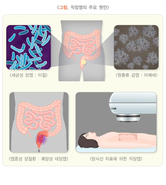 이러한 염증장질환의 원인은 아직 완전히 밝혀지지는 않았으나, 유전적 요인을 가지고 있는 사람에게 환경적 요인(바이러스, 세균, 음식물 등)이 작용하였을 때 발생하는 것으로 알려져 있습니다. 염증장질환 외에도 감염, 방사선, 항생제, 수술 및 다양한 자극제 등이 직장염의 원인이 될 수 있습니다. 감염성 직장염의 경우 여러 바이러스(노로바이러스, 로타바이러스), 세균(콜레라, 대장균, 이질, 장티푸스, 예르시니아, 캠필로박터), 원충(아메바) 등이 원인으로 작용하며, 대표적으로 이질, 아메바가 있습니다. 또한 국내에는 흔하지 않지만, 남성 동성애자 사이의 성행위로 인하여 매독, 임질, 클라미디아와 같은 성병이나 단순 포진 바이러스 등이 전파되어 감염성 직장염이 발생할 수도 있습니다.