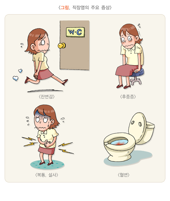 직장염의 대표적인 증상은 설사와 혈변이며, 잔변감이나 복통도 흔히 나타나는 증상입니다. 이러한 증상은 급성으로 발생했다가 사라질 수도 있으나 만성으로 지속될 수도 있습니다. 만성으로 지속될 경우에는 피로감, 구역, 구토, 식욕 감소, 체중 감소, 빈혈 및 미열 등 전신 증상이 동반될 수 있습니다. 미열이 아닌 고열이 있는 경우에는 합병증을 의심해야 합니다.