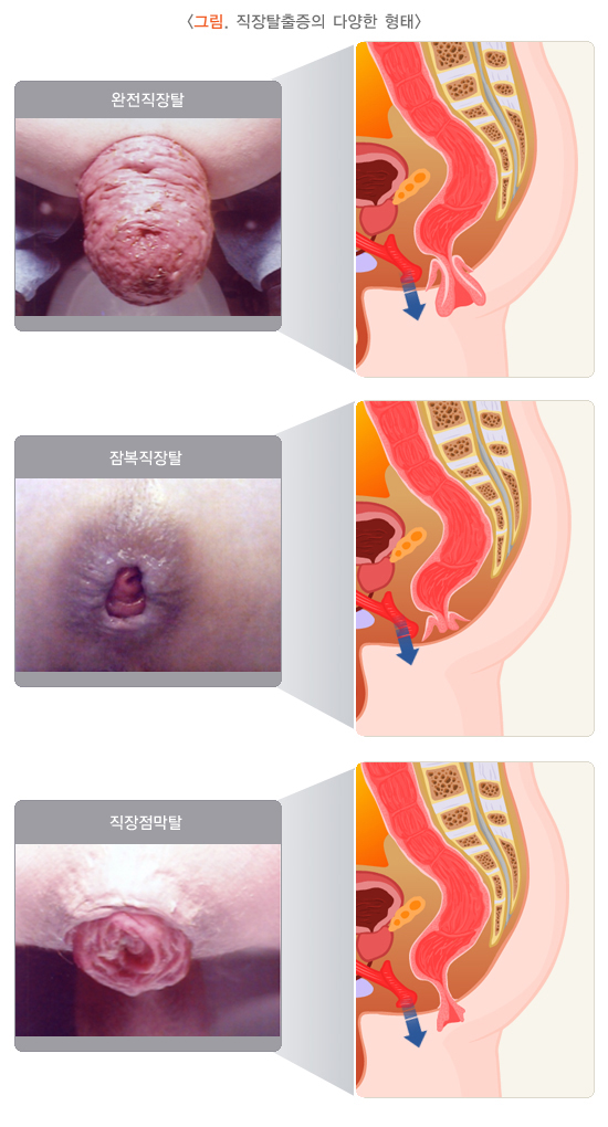 직장의 점막만 탈출되면 부분 탈출증 또는 점막 탈출증이라고 하며, 잠복직장탈출은 직장탈출증의 시초 단계로, 중첩된 직장이 항문을 통해 빠져 나오지 않은 채 직장 내에 머물러 있는 상태입니다.