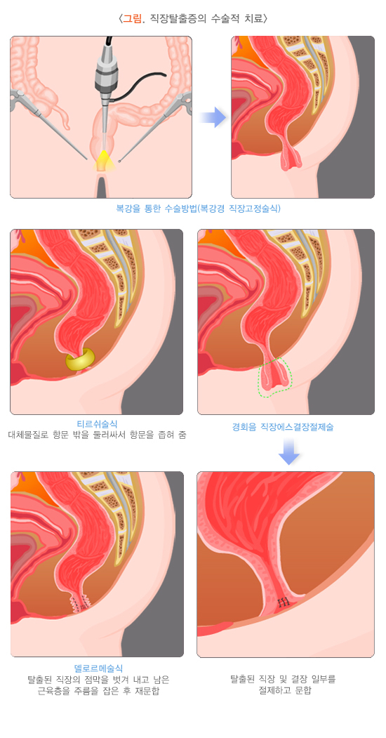 직장탈출증은 수술이 유일한 치료법입니다. 수술방법은 복강을 통한 복부 접근법과 항문을 통한 회음부 접근법으로 나뉩니다. 치료 목적은 탈출증의 교정과 더불어 배변조절의 회복, 변비나 불완전한 배변의 방지에 있습니다. 그러나 모든 치료목적을 달성할 수 있는 이상적인 방법은 없고, 현재까지 100여 가지 수술방법이 소개될 정도로 다양하기 때문에 외과의료진들은 이들 중 수술방법을 선택하는 데 어려움을 느끼기도 합니다.