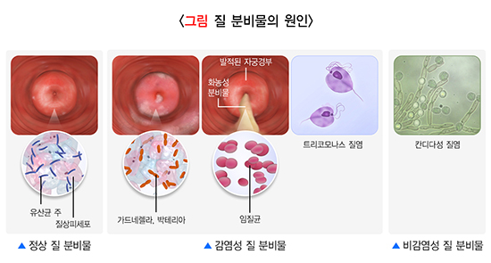 정상적인 질 분비물은 질과 자궁경부의 분비샘에서 분비되며, 생리주기 및 여성호르몬 등에 따라 상태가 조금씩 변합니다. 한편, 병적인 질 분비물은 감염 및 정상 세균총의 변화, 여성호르몬 감소 등이 원인이 됩니다.