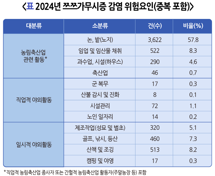 - 직업과 관계없이 밭농사, 과수원, 목축업, 산일(밤 줍기) 등의 농림축산업 관련 작업에 참여한 경우 발생위험 증가할 수 있습니다.