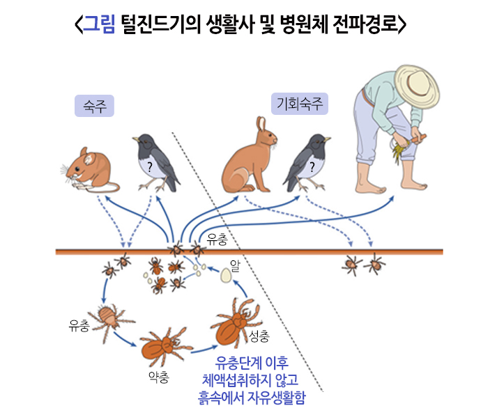 쯔쯔가무시증의 매개체인 털진드기는 알→유충→약충→성충의 네 단계 변태를 거칩니다. 털진드기의 유충이 성장하기 위해 숙주동물(사람 등)에 붙어 체액을 섭취하는 과정에서 사람이 감염됩니다. 주로 팔, 다리, 머리, 목 같은 노출 부위나 사타구니, 목덜미, 겨드랑이, 엉덩이 같은 습한 부위를 물어 체액을 흡인할 때 진드기 유충 속에 있던 쯔쯔가무시균이 인체 내로 들어가 병을 일으킵니다.