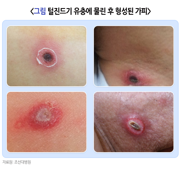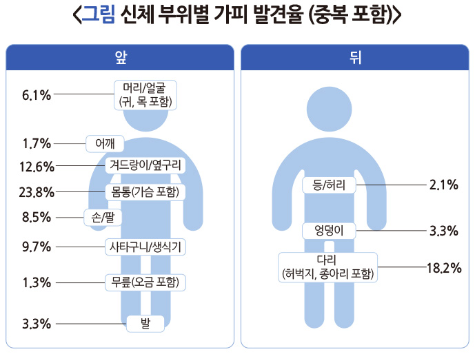 가피는 몸의 앞쪽(복부, 가슴 부위)에 더 많이 나타나며, 성별에 따라 위치가 조금 다릅니다. 남성은 주로 배꼽 아래 30 cm 부근, 여성은 가슴과 배 부위에서 잘 발견됩니다. 이 가피는 가을철에 발열을 동반하는 다른 질환, 예를 들어 신증후출혈열이나 렙토스피라증과 쯔쯔가무시증을 구별하는 데 매우 중요한 단서가 됩니다. 진드기매개감염병이 의심되는 경우 진드기에 물린 부위 확인이 중요하며, 털진드기에 물린 자국(가피) 발견율은 약 83.1%(2024년 기준)입니다.