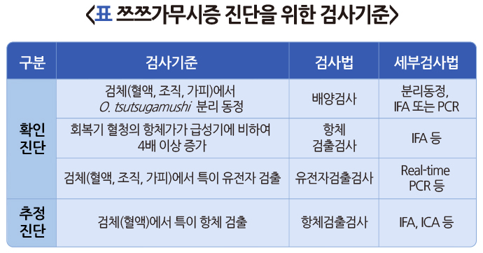 쯔쯔가무시증은 대부분 가을철에 발생하며, 야외 활동 이력이 있고 가피와 발진이 보이면 임상적으로 진단할 수 있습니다. 그러나 가피나 발진이 나타나지 않는 경우 있어, 증상만으로 쯔쯔가무시증을 진단하기 어려울 수 있습니다. 이때는 혈액 검사나 유전자 검사, 배양 검사 등으로 확진합니다.