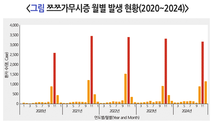 10~11월에 가장 많이 발생하며, 이는 털진드기 유충이 발생하는 시기와 일치합니다.