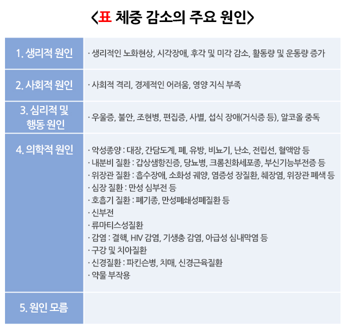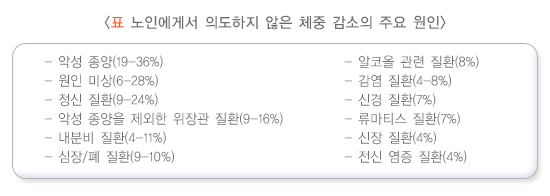 60세 이후가 되면 병이 없어도 노화 때문에 근육이 감소하고 지방조직이 증가하여 매년 평균 0.5% 정도 체중이 줄어듭니다. 노인에서 나타나는 생리적인 식욕 감소의 원인은 다양합니다. 활동량이 줄고 근육이 감소하여 음식 섭취에 대한 수요가 감소하고, 음식 냄새나 맛을 잘 못 느끼게 되며, 잘 씹지 못하거나 소화가 느려지고 포만감과 공복감을 느끼게 하는 호르몬 활동이 변화하면서 식욕부진이 생깁니다. 노인에서 흔한 체중 감소의 원인은 신체적인 질병 외에도 치매, 우울증, 음식 섭취 장애, 냄새를 잘 못 맡는 것, 설사, 약물 부작용, 치아 문제, 기능 저하 등으로 매우 다양합니다. 노인에서는 질병에 의한 것이 아닌 정신-심리적 원인에 의한 체중 감소가 흔하다고 알려져 있습니다. 노인에게서 의도하지 않은 체중 감소는 사망률을 증가시키므로 즉각적인 평가가 중요합니다.
