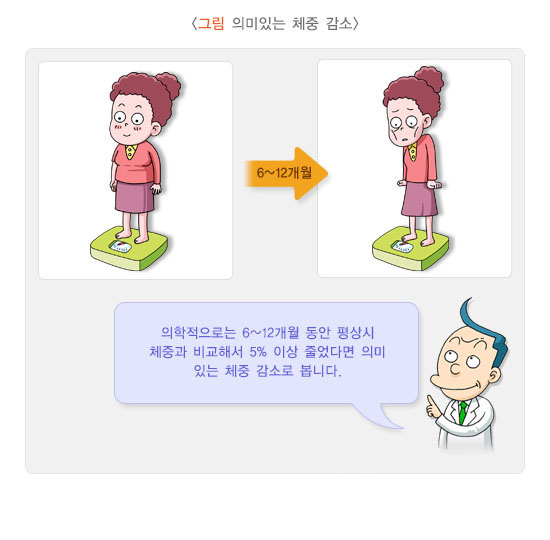 따라서 체중 감소에 대한 적절한 검사와 평가를 하고 원인에 대한 치료를 하는 등의 노력으로 다시 체중을 늘리지 않는다면 1~2.5년 이내에 사망률이 9~38%까지 증가한다는 보고가 있으므로 체중 감소는 가볍게 넘길 문제가 아닙니다.