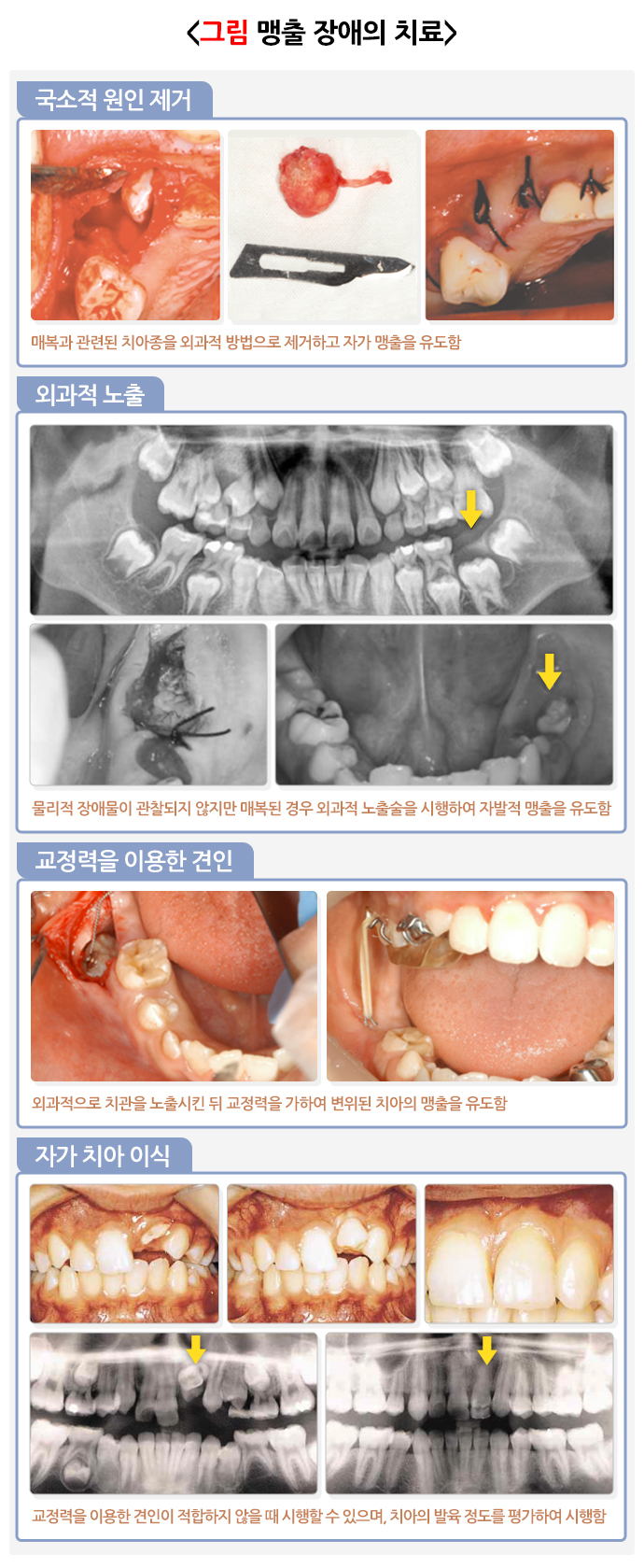 맹출 장애의 치료 방법은 발생 원인, 치아의 발육정도, 치배의 위치 및 맹출경로, 환자의 협조 등을 고려하여 결정합니다. 유전적 원인이 의심된다면 일찍 치료를 시작할 수 있습니다. 맹출에 방해가 되는 국소적인 원인은 먼저 제거되어야 합니다.